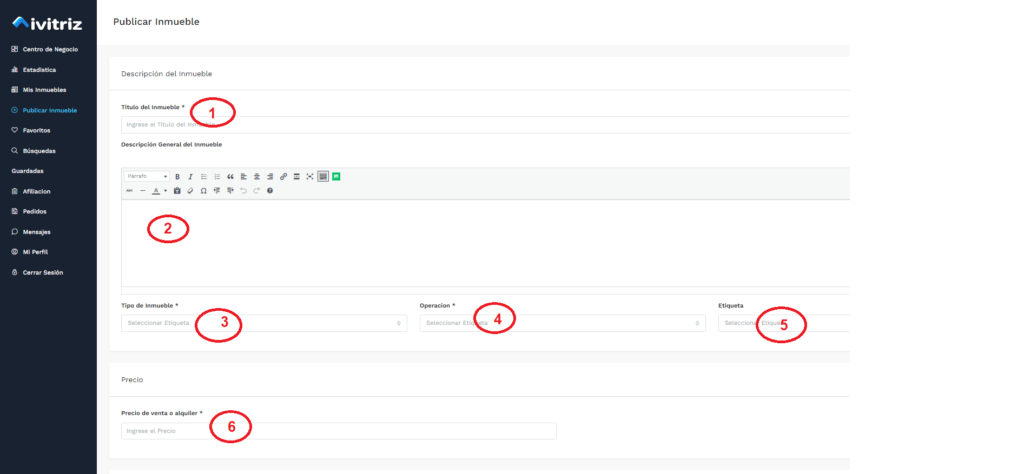 (6)  Precio: (* campo obligatorio)  escriba el precio correcto, y verifique en la parte publica, por ejemplo para un inmueble que cuesta  (25.000,00)    debe escribir  25000   el sistema adapta los puntos necesarios. No ponga comas o puntos.