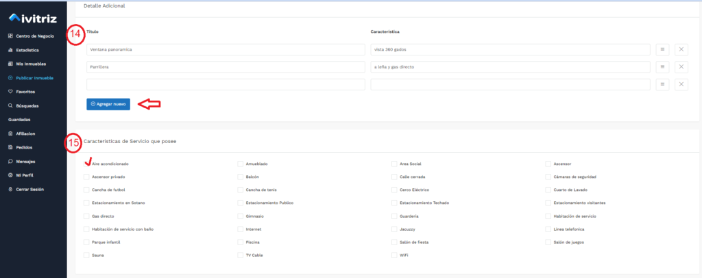 (15) Características:  Marque todas las que tenga su inmueble y si requiere más características adicionales las puede crear en el bloque anterior. Nro. 14