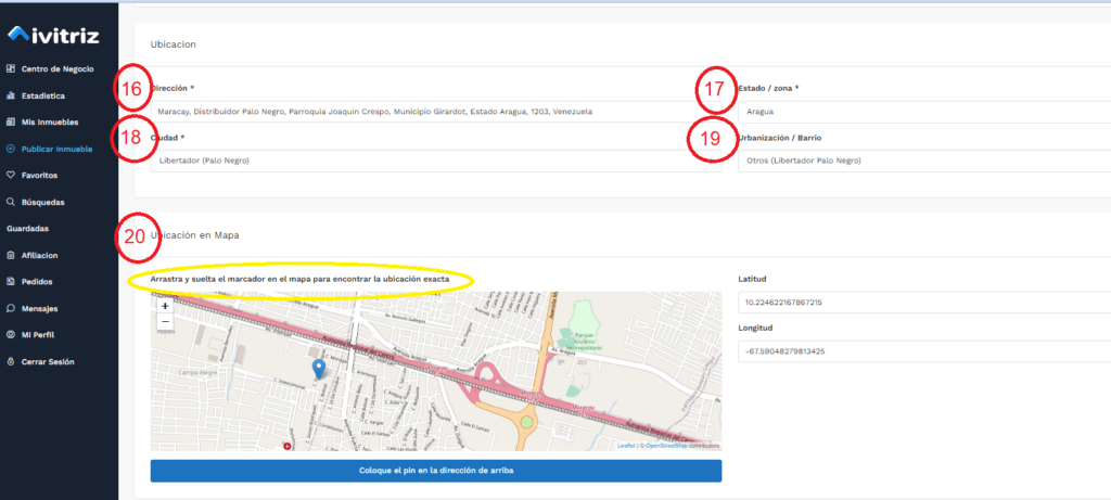 Es muy importante que te guíes con el mapa si la ubicación del inmueble es la apropiada ya que aparecerá en “búsqueda por mapa”. Puede ir al mapa y ajustar la ubicación moviendo el pin de marcación con el cursor.