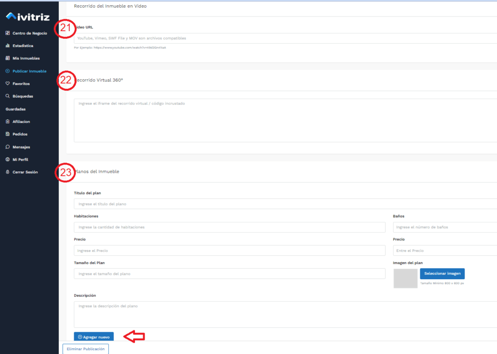 (22) Recorrido Virtual 360°: En caso que tengas un video de tu recorrido virtual es aquí donde puedes insertar el inframe o código incrustado