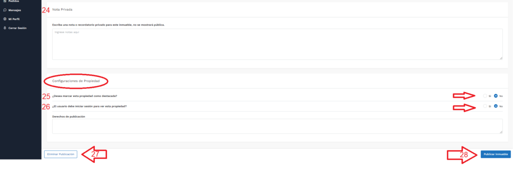 Al marcar SI  (*), solo usuarios registrados, que han iniciado sesión pueden ver su inmueble es decir se convierte en un inmueble privado no se ve en la parte pública.  Solo lo verán agentes, agencias y publicadores.