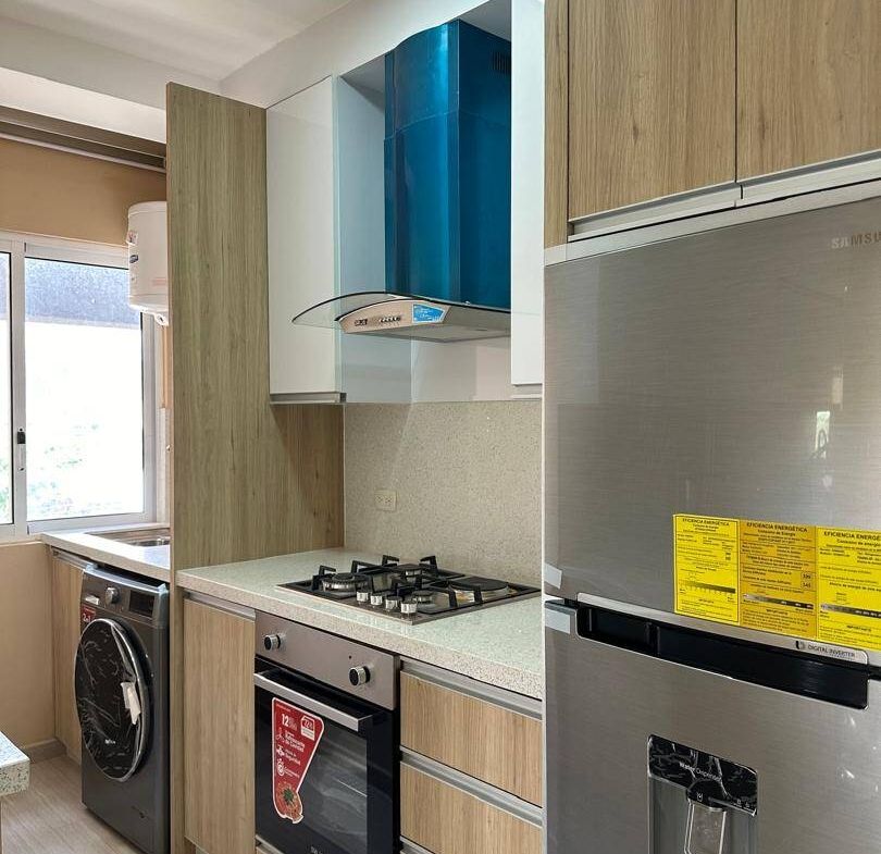 COCINA NUEVA EQUIPADA CON TOPE DE CUARZO ( ESTUFA, CAMPANA, NEVERA), AREA DE LAVANDERIA CON LAVADORA Y CALENTADOR,