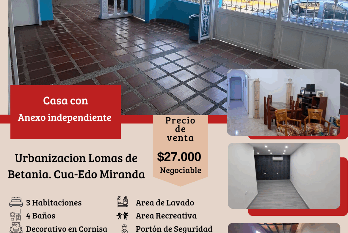 ¡EXCLUSIVA OPORTUNIDAD! Casa con Anexo y Acabados de Primera en Urbanización Privada y Segura en los Valles del Tuy. Esta propiedad ofrece un estilo de vida privado con vigilancia y control de acceso garantizado por circuito y cámaras de seguridad, además de portón eléctrico.